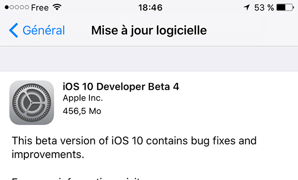 Apple vient tout juste de sortir la quatrième bêta d’iOS 10 laquelle se destine aux développeurs pour le moment. Apple n’apporte pas beaucoup de précisions quant aux nouveautés. Il s’agit principalement de corrections de bugs et autres améliorations de la stabilité générale du système.