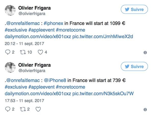 Si l’on avait déjà une petite idée des prix des iPhone X, iPhone 8 et iPhone 8 Plus, Olivier Frigara, journaliste de On refait le Mac, a twitté les possibles vrais prix en euros !