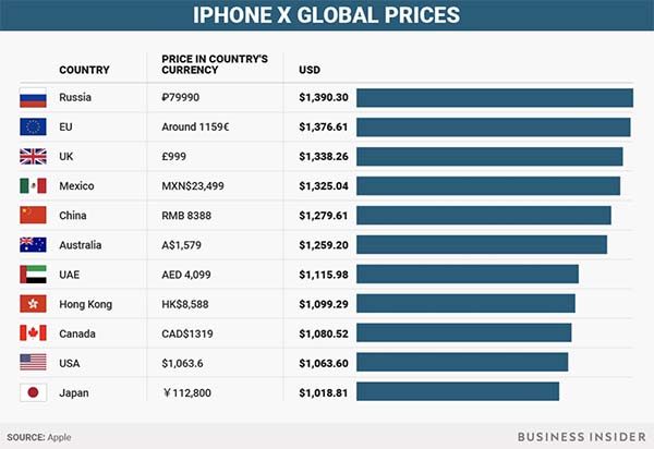 Entre la Russie et le Japon, il y a un fossé de 360 dollars après conversion. L’Europe se situe à la seconde place de ce classement avec un prix de 1 1376,61$ (1 329€ exactement pour l’iPhone X de 256Go). Entre les taxes, les devises, les frais d’importation, les prix peuvent varier de manière significative entre chaque pays.