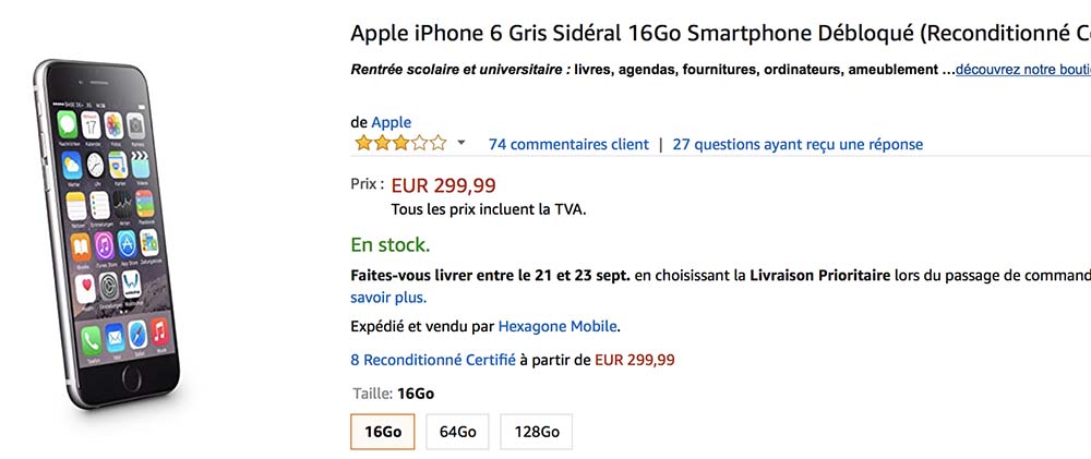 Aujourd’hui, vous trouverez sur Amazon de nouvelles offres sur l’iPhone 6 et l’iPhone 6s 16 Go Gris sidéral à partir de 299€.