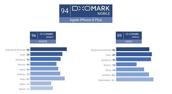 Chaque année, DxOMark se lance dans une batterie de tests afin de parvenir au classement des 10 meilleures caméras intégrées dans des smartphones. Avec un score respectif de 92 et 94 points, les iPhone 8 et 8 Plus se placent devant le Pixel de Google (90 pts), et le HTC U11 (90 pts). Il font même mieux que les iPhone 7 (85 pts) et 7 Plus (88 pts).