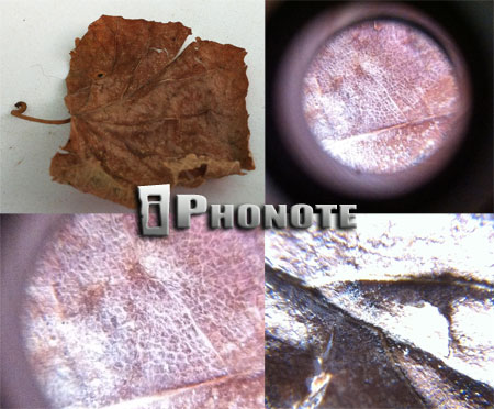 Il y a un zoom intégré au microscope auquel s’ajoute celui de votre iPhone 4. Le résultat est vraiment intéressant et très net. Comme vous pouvez le voir sur nos screenshots sur un exemple de la feuille prise pour cobaye. Je vous rassure, elle n’est plus de ce monde depuis. 😉