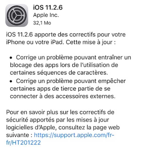 Apple vient tout juste de sortir iOS 11.2.6, une version qui fera plaisir à ceux qui ont été touché par le bug Telugu. En effet, cette nouvelle mouture corrige plusieurs problèmes qu’Apple détaille dans la note de la mise à jour.