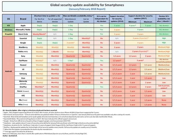 Excellentes notes pour les terminaux Windows Phone. Essential Phone et Google sont cependant les seules deux marques Android à avoir obtenu des résultats suffisants, même si les deux ont été critiqués pour avoir commis plusieurs mises à jour aux opérateurs (également avec des retards en mois) et le support des dispositifs avec des mises à jour de sécurité n’est de 3 ans seulement.