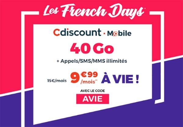 › Forfait Cdiscount 40 Go : 9,99 € au lieu de 15 € à vie grâce au code AVIE.