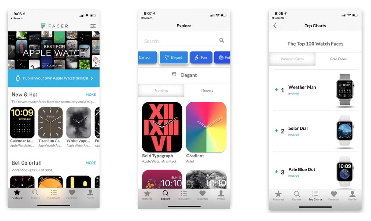 Avec la nouvelle mise à jour, Facer devient un véritable hub pour découvrir et télécharger de nouveaux cadrans Apple Watch, partager ceux que vous aimez et garder une trace de vos favoris. Il existe à la fois des cadrans gratuits et payants et il sera plus facile de trouver de nouveaux cadrans intéressants grâce aux classements et aux sections en vedette. De plus, directement depuis l’application, vous pouvez désormais partager vos cadrans avec d’autres sans aucun problème.