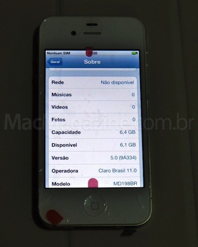 La version du firmware est en version iOS 5 avec le numéro de modèle MD198BR. Une source proche de MacMagazine.com.br indique une sortie officielle le 2 décembre.