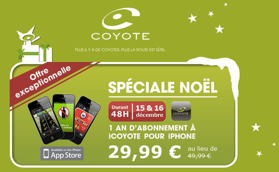 En cette fin d’année, l’éditeur d’iCoyote propose le 15 et 16 décembre l’abonnement d’un an à 29,99€ au lieu de 49,99€. Cette application vous assiste durant vos trajets en vous indiquant différentes choses comme : les zones de dangers ou à risque, les perturbations, les accidents, les radars fixes et mobiles de façon légales et bien d’autres.