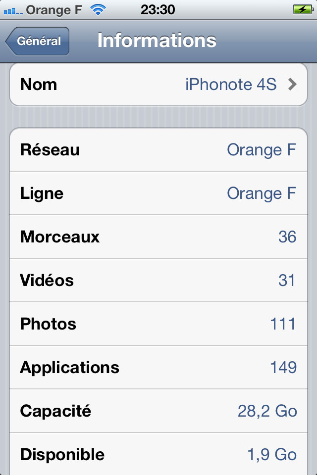 Peut-être est-ce dû à l’importante quantité d’informations et applications enregistrés dans l’iphone. Sur les 32Go de libres, seulement 1,9Go est disponible.