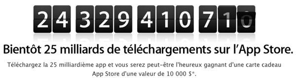A l’approche des 25 milliards de téléchargements sur l’App Store, apple organise un concours pour gagner 10.000$ à dépenser sur iTunes pour le 25 milliardième. Mais peut-être que vous ne savez pas quel est le meilleur moment pour tenter sa chance. alors nous avons fait quelques calculs très simples en fonction du nombre de téléchargements à la seconde.