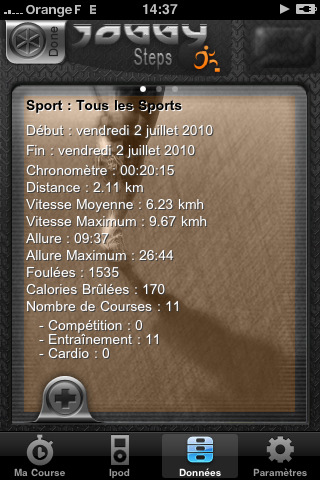 Joggy Steps embarque toutes les fonctionnalités musicales de l’Ipod. Tu pourras notamment retrouver toutes les musiques écoutées lors d’une session en particulier et analyser les performances réalisées sur un morceau en particulier et une période donnée.