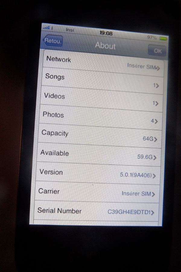 De plus, addil a contacté Apple pour vérifier le numéro de série auprès de leur service. Le numéro de série correspond à un iPhone 4S 16Go. Ceci signifie que les vendeurs utilisent de vrais numéros de série pour leurs arnaques. Aussi, vous constaterez dans les photos que la capacité de cette copie est de 64G0.