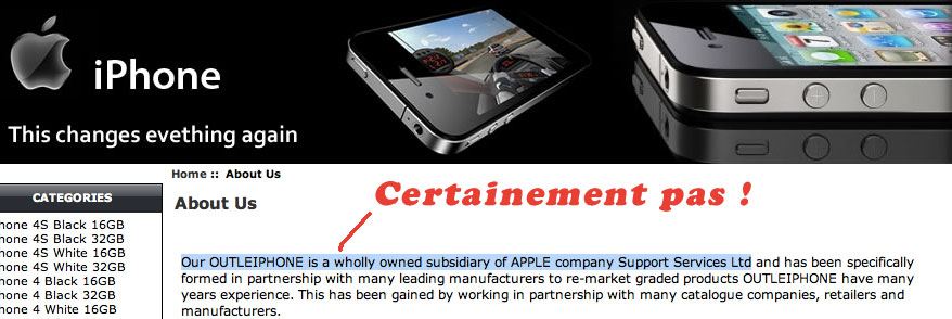 Aujourd’hui, c’est l’un de nos lecteurs derrière le pseudo « addil » qui a été arnaqué par un nouveau site nommé http://www.outletiphone.com. Il nous a contacté via noter article de mars, après avoir acheté et reçu son iPhone 4S provenant du site cité plus haut.