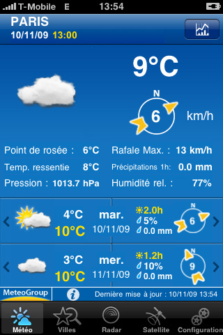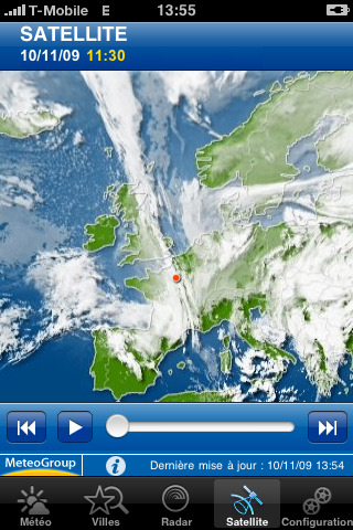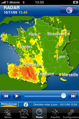 Weather Pro, l’application des spécialistes européens de la météo, fournit des observations et des prévisions de haute qualité pour plus de 2 000 000 villes dans le monde. Les prévisions sont disponibles jusqu’à 7 jours d’échéance et toutes les 3 heures. Weather Pro peut vous localiser si vous utilisez un Iphone 3G ou tout Iphone dans un pays qui permet la localisation. Weather Pro fournit aussi des images radar dans les pays suivants : Allemagne, Pays-Vas, Belgique, France, Espagne, Suisse, Angleterre et Etats-Unis, ainsi que des images satellites pour l’Europe. Plus de 10 images peuvent être téléchargées et animées. Ces animations peuvent bien sûr être zoomées et panoramiques.