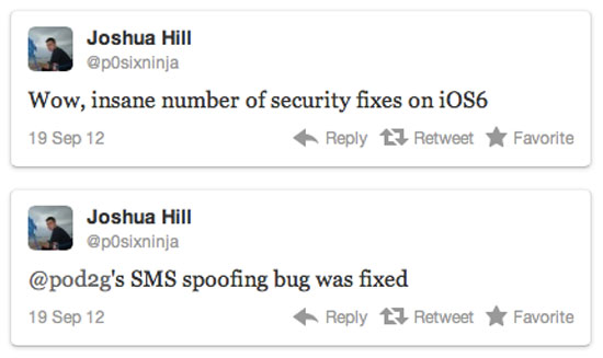 Rappelez-vous en août, une faille de sécurité des SMS à été soulevée par le hacker français Pod2g dans cet article. Et bien, il semblerait qu’Apple est corrigé le problème dans l’iOS 6. C’est via son Twitter que Joshua Hill connu sous son pseudo p0sixninja annonce la bonne nouvelle, la sécurité est donc pleinement fonctionnelle. Pour information, la faille permettait de modifier le nom de l’expéditeur et ainsi se faire passer pour votre banque ou autres.