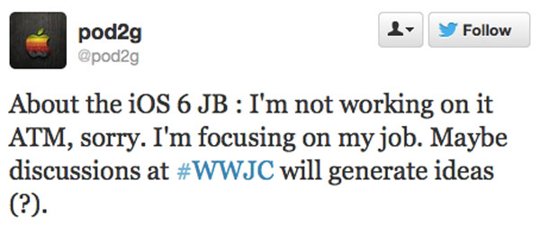 C’est bien une mauvaise nouvelle que le hackeur français Pod2g a twitté hier en indiquant qu’il ne travaillait pas actuellement sur le Jailbreak de l’iOS 6 pour cause d’avoir un emploi. Ce qui semble normal ! Il a déjà fait beaucoup pour le Jailbreak des autres iOS donc on ne lui en voudra pas. Et ce n’est pas un adieu mais peut-être qu’une pause…