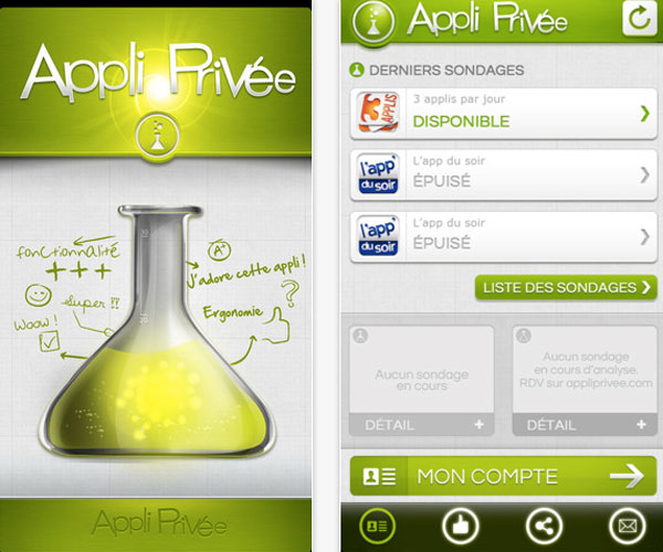 Appli Privée vous fait gagner de l’argent en testant des applications. Vous cumulez 0,25€ par sondage réalisé et pouvez retirer vos gains dès 5€. Appli Privée est la plus grande communauté de testeurs d’applications mobile du monde. Faites comme les 600 000 personnes qui ont déjà rejoint notre communauté sur iPhone et iPad depuis 2010, devenez testeur d’applications !