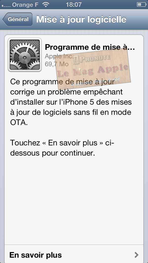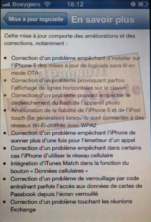 • Correction d’un problème empêchant d’installer sur l’iPhone 5 des mises à jour de logiciels sans fil en mode OTA