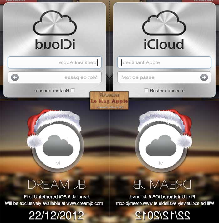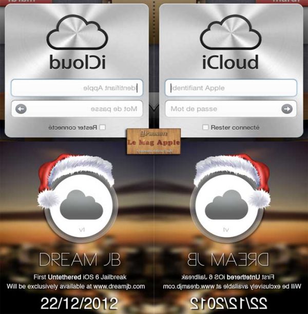 Il ajoute qu’une fois le Jailbreak ouvert au public, Apple aura la possibilité de corriger la faille très facilement. Là où notre raisonnement intervient, c’est avec l’image du nuage d’iCloud en version « v1 » que le hackeur utilise sur son site, sauf que l’image du nuage est à l’envers comme le montre ce montage ci-dessous :