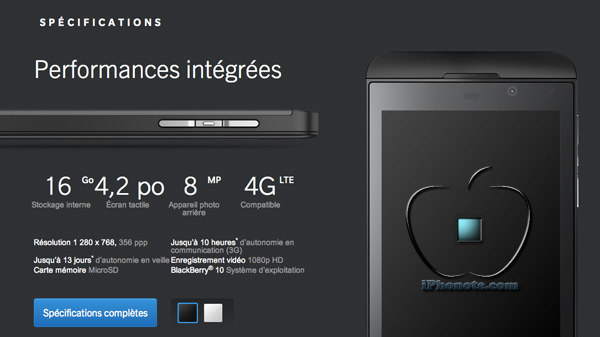 Le BlackBerry Z10 embarque des caractéristiques intéressantes : un processeur MSM8960 double coeur cadencé à 1,5 GHz, 2 Go de RAM. Côté batterie, ce sera une de 1800 mAh, certainement pas l’un de ses points forts mais néanmoins il sera possible de la changer et  d’en avoir une de secours. Vous aurez également la possibilité d’ajouter de la mémoire jusque’à 48 Go via une microSD. Tout comme l’iPhone, le Z10 est doté d’une capteur photo de 8 mégapixels capable de capturer en 1080p. Sur la face avant, une caméra de 2 mpx pour  filmer en 720p. Pour finir, le Z10 complète ses caractéristiques avec un écran tout tactile de 4,1 pouces d’une résolution de 1280 x 768 égal à 356 PPI, meilleur que sur l’iPhone 5. Il sera proposé en deux coloris : Blanc et noir. Plus d’informations sur le site officiel.