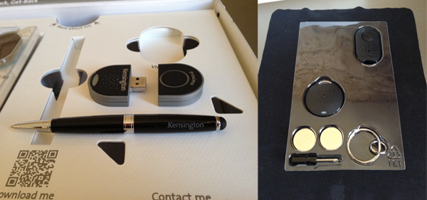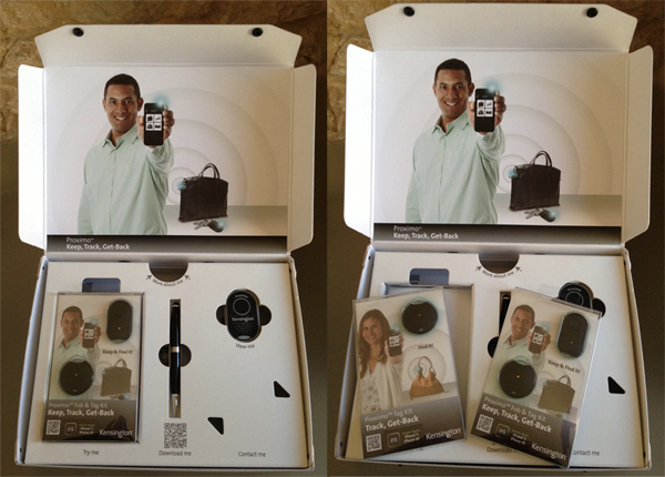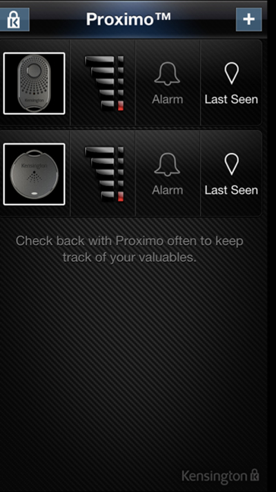 Nous venons de recevoir une petite valise contenant ce kit Proximo + un Kit balise + un stylo 2 en 1 pour écran tactile + une clé USB de 1 Go. Commençons par le début avec le Kit principal qui lui embarque un deux modules Bluetooth 4.0 + deux piles plates + un tournevis (pour insérer les piles). Une fois le kit prêt à l’emploi, vous devez télécharger l’application Proximo™ de Kensington afin d’appareiller les balises à votre iPhone 5/4S. Ensuite, vous êtes invités à activer le Bluetooth sur votre appareil depuis l’application qui permet d’ajouter les balises qui doivent être allumés.
