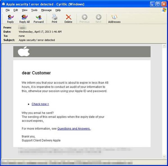 Elle concerne principalement les utilisateurs des États-Unis, de Grande-Bretagne mais également ceux en France. L’arnaque se fait en premier lieu par mail qui vous demande ensuite de cliquer sur un lien, lequel vous amène sur internet pour entrer vos coordonnées bancaires. Nous ne pouvons que vous conseiller d’effacer immédiatement ce mail et éviter tout problème. Dans le cas contraire, les escros pourront utiliser votre compte pour faire quelques achats sur le store d’Apple et se faire livrer à une autre adresse que la vôtre. Je vous laisse imaginer votre état de nerf si vous en étiez victimes…