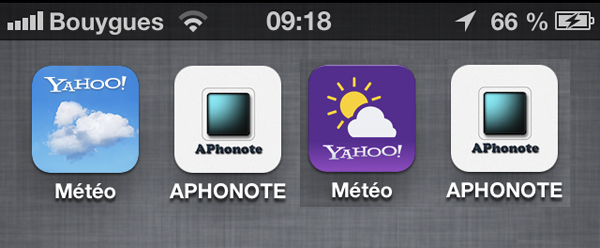Aujourd’hui, Yahoo propos une petite mise à jour de sa nouvelle application Yahoo! Météo (Gratuit) qui passe en version 1.0.3. N’y aurait-il pas un air d’iOS 7, là-dedans ? C’est en tout cas ce que l’on peut penser avec cette nouvelle icône qui supprime toutes traces d’effets d’ombres et surbrillance. Yahoo a finalement opté pour une icône totalement plate et un vrai nuage sans soleil ! Pas de soleil ! C’est un peu notre actualité du moment…