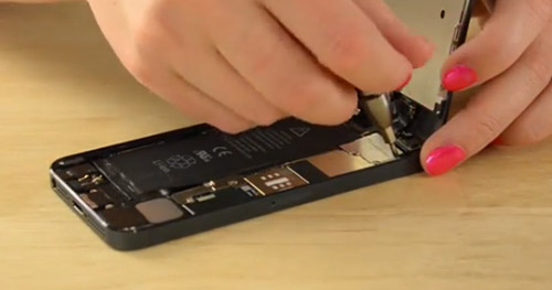 Le processus de démontage est assuré par les mains expertes de la demoiselle au vernis rose. Avant cela, vous devez vous munir d’outils spéciaux vendus sur iFixit (kit à 100$ incluant la batterie) ou Ebay. Notez que lors de l’achat d’une batterie d’iPhone 5, les vendeurs inclus généralement le kit d’outils gratuitement.