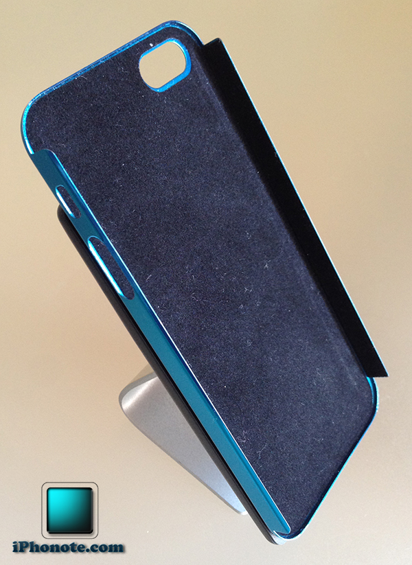 Toujours à propos du revêtement feutré, celui-ci est également présent sur les bords intérieurs. De plus, il permet de ne pas interférer avec l’antenne. Vous aurez compris que la coque protège bien l’arrière et les bords. Mais attention tout de même, cette coque n’est pas destinée aux baroudeurs ou aux chantiers. Elle est surtout faite pour apporter un effet classe supplémentaire aux belles lignes esthétiques de l’iPhone 5. Comme on le voit sur nos photos, les bords en haut / bas ne sont pas protégés sur l’avant. Alors attention aux chutes !