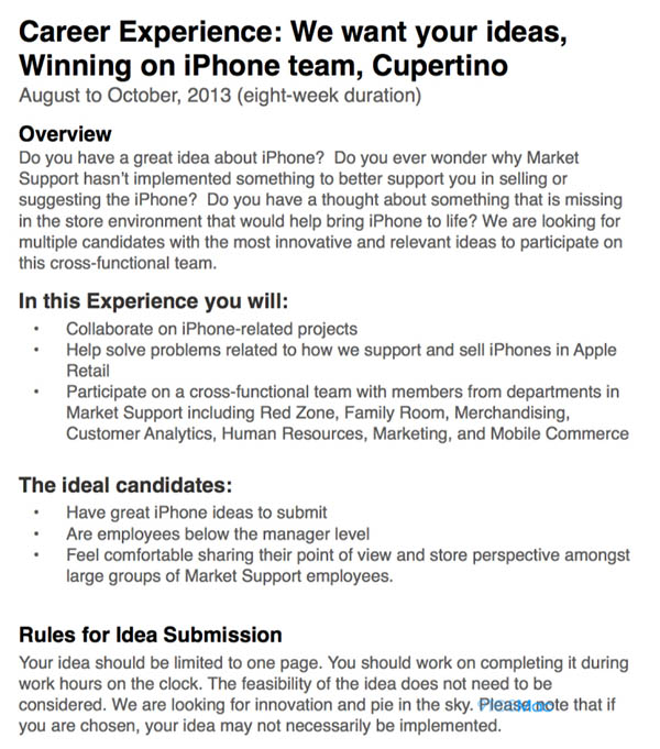 Du fait, la firme de Cupertino invite ses employés à donner leurs idées. Les meilleures seront retenues puis étudiées par les équipes d’Apple. Les employés dont les idées auront été les plus pertinentes recevront un ticket gagnant pour un long voyage de 8 semaines au Campus de Cupertino, le siège social d’Apple. Ils travailleront avec les personnes en charge du marketing et élaborerons les meilleures stratégies marketing pour remplir les Apple Store de nouveaux clients iPhone et des autres produits.