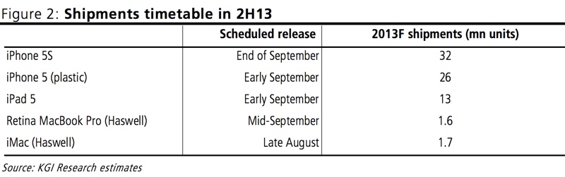 Du côté de l’iPhone 5S, Ming-Chi le voit pour une sortie au public dès la fin septembre, peut -être début octobre. L’analyste nous propose un tableau où il dévoile les différentes sorties et le nombre d’unités qui sera produite pour chacun d’eux. Pour l’iPad mini Retina tant attendu, l’année 2013 ne sera visiblement pas la bonne année, il vise plus à début 2014…