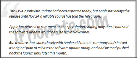 « L’IOS 4,2 mise à jour logicielle qui avait été prévu aujourd’hui, mais Apple a retardé la relâcher jusqu’à ce 24 novembre, une source fiable a déclaré au Telegraph.