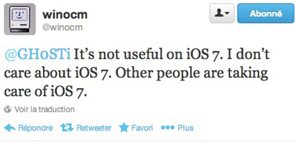 Pour finir, Winocm ajoute dans un autre tweet le message suivant : « Ce n’est pas utile sur iOS 7. Je ne m’intéresse pas à iOS 7. D’autres personnes s’intéressent à iOS 7 ». On peut comprendre par là que son exploit ne fonctionne pas sur iOS 7, et d’autres hackeurs sont déjà sur le coup.