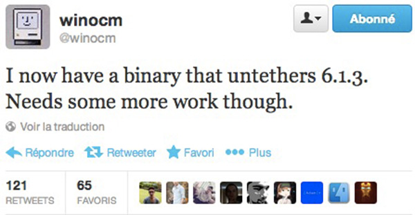 Aujourd’hui, le hackeur Winocm annonce sur son Twitter avoir trouvé une autre faille permettant de faire le Jailbreak d’iOS 6.1.3 de façon Untethered (sans l’assistance d’un ordinateur pour le rallumer). L’homme est connu pour avoir travaillé avec la Dev Team, ce n’est donc pas un canular. Il explique avoir testé son exploit sur un iPhone 4 et le résultat a été positif. En revanche, il nous dit pas si cela fonctionnerait sur les appareils plus récents, un sujet qui devrait intéresser la majorité des utilisateurs.