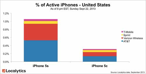 Pour l’heure, l’iPhone 5S représente 1,36% du nombre total d’iPhone actifs aux USA, là où l’iPhone 5C ne représente que 0,31%, d’après les analystes de Localytics.