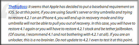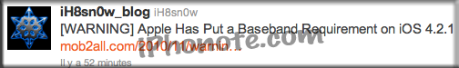 iH8sn0w, nous annonce qu’Apple aurait inclus certains pièges avec l’introduction d’une exigence sur le Baseband de l’iOS 4.2.1.