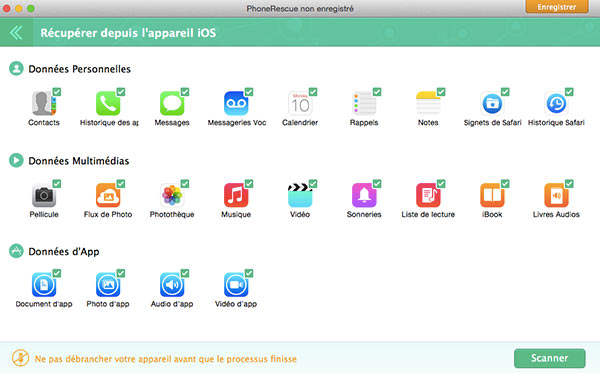 Après avoir sélectionné le type de contenu que vous voulez récupérer, il vous restera plus qu’à cliquer sur scanner et laisser le logiciel trouver les fichiers récupérables. Pour les sauvegardes iTunes, le processus se fait assez vite, mais pour les appareils remplis de dizaines de giga de fichiers, cela pourra prendre quelques minutes (le pourcentage d’avancement du processus sera alors affiché).