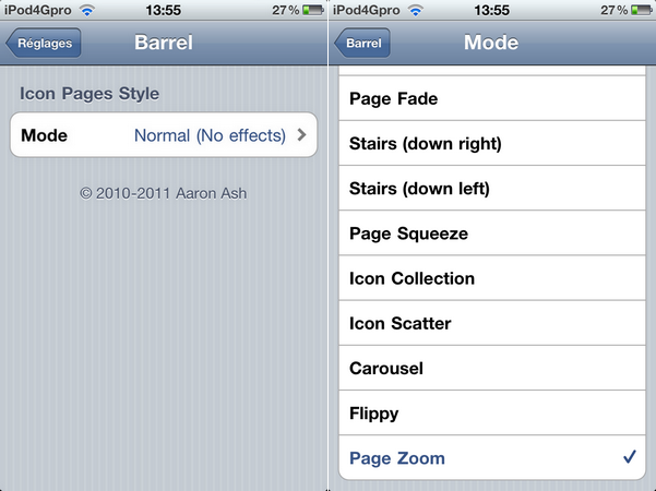 Barrel est un tweak disponible sur le Cydia Store qui vous permet de remplacer l’effet de changement de pages sur le SpringBoard.