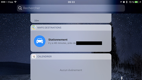 Bon bha pas de bol … Ça a fonctionné mais qu’une fois ! quand j’ai appareillé mon kit main libre et que j’ai déconnecté j’ai bien eu la notification « Stationnement » sauf que celle-ci était toujours présente arrivé au boulot après déconnection du kit … donc en gros il m’indiquait toujours être en stationnement chez moi alors que j’étais au boulot 40 km plus loin … Probablement pas au point car beta .. Qui que car je n’ai jamais réussi a avoir le widget batterie dans mon centre de notification avec aucune version iOS 9 et toujours indisponible avec la beta 10 …